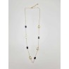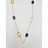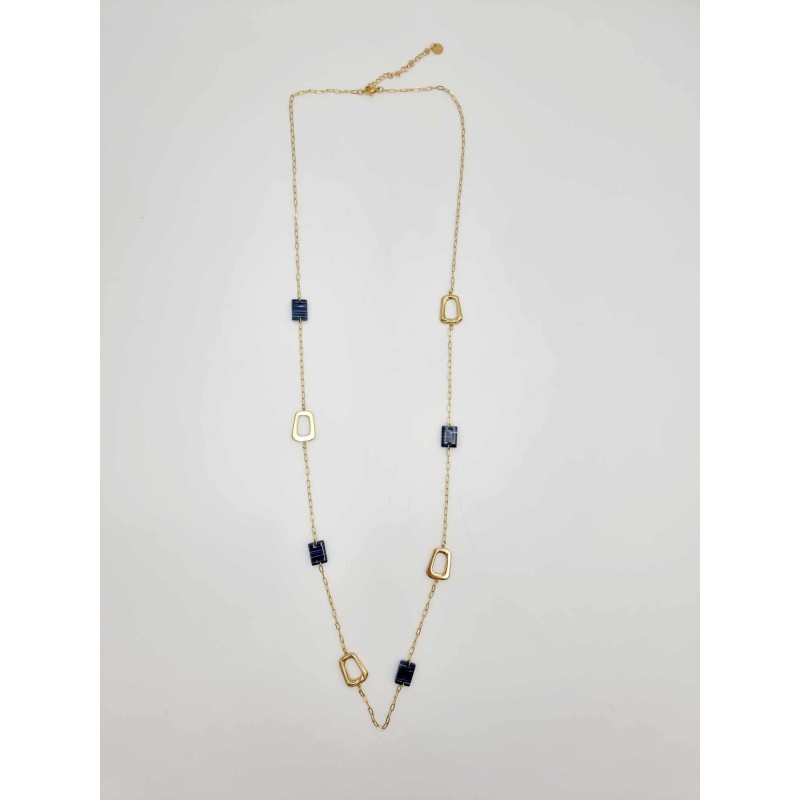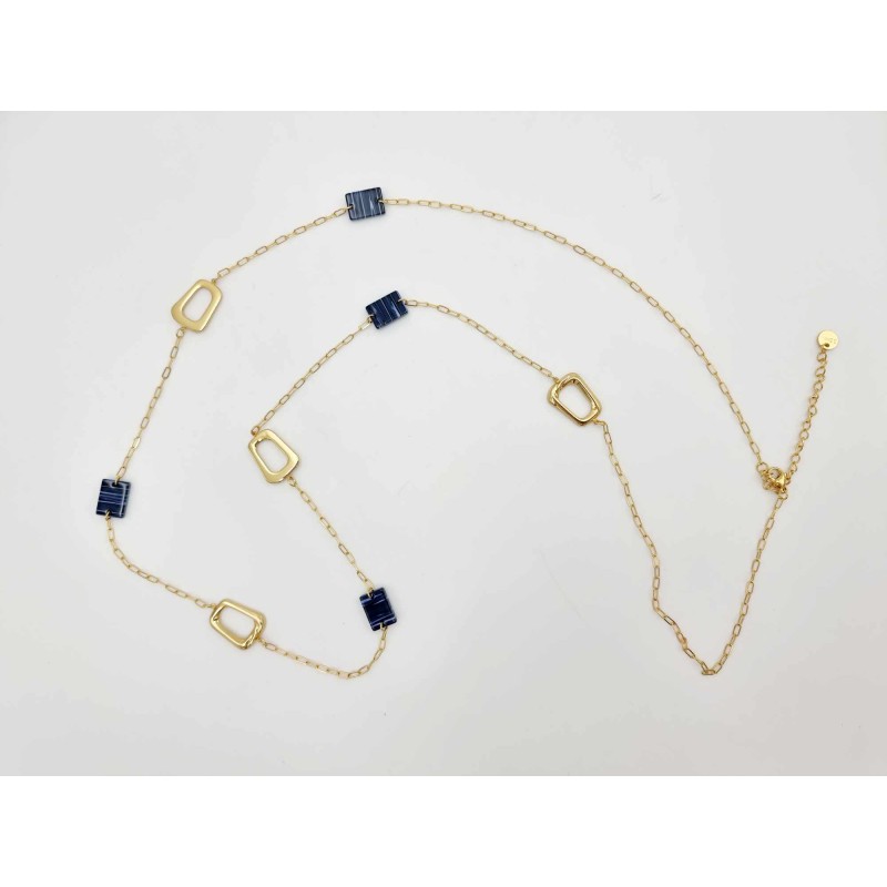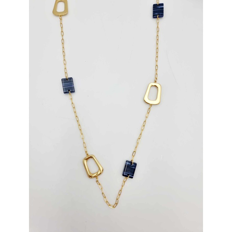 552417 Halskæde lang med firkanter & guldkæde. Blå