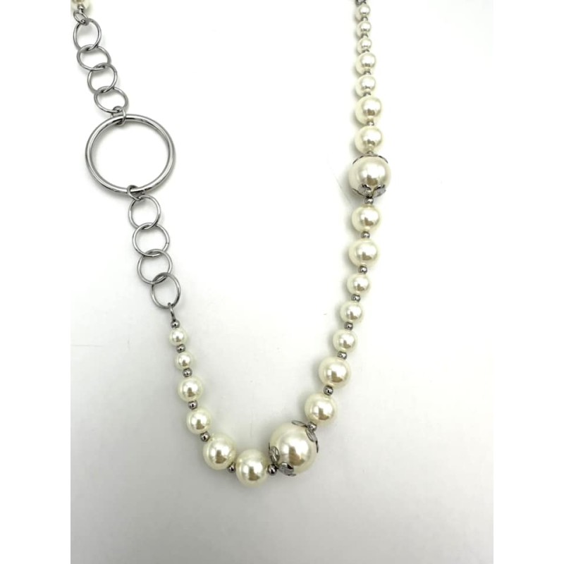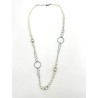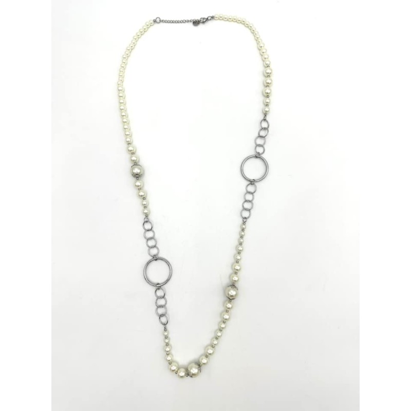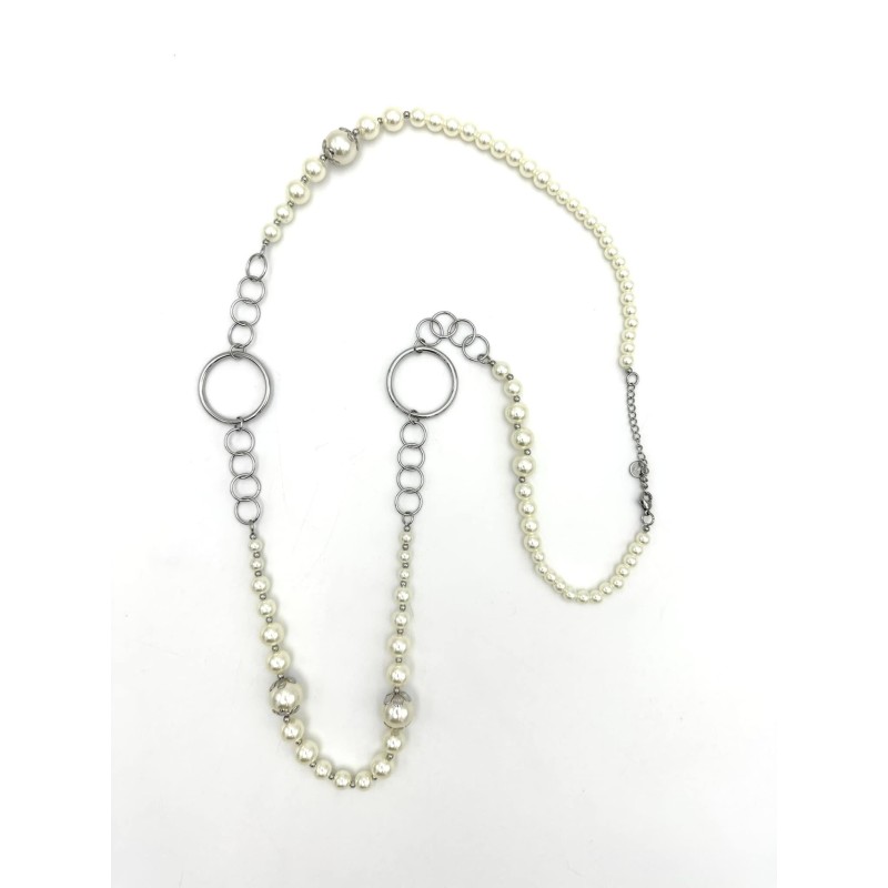 552428 Halskæde lang hvid med perler & runde ringe. Sølv