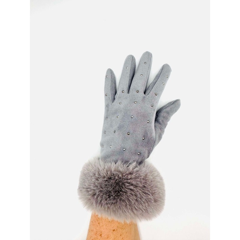 332004 Handske med sten/fake fur. Imiteret russkind.One Size. Lysegrå
