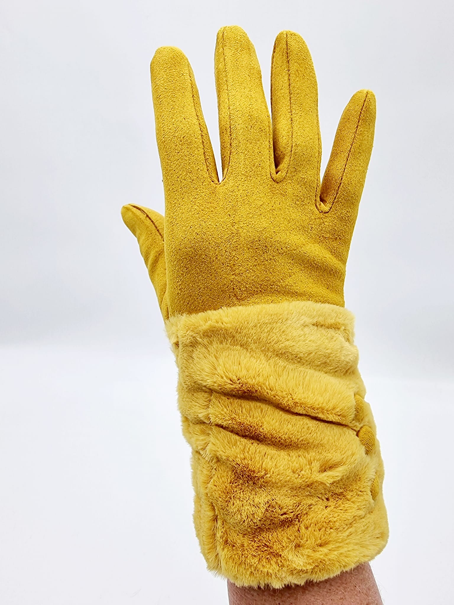 331901 Handske imiteret ruskind/3 knapper & fake pels. Karry