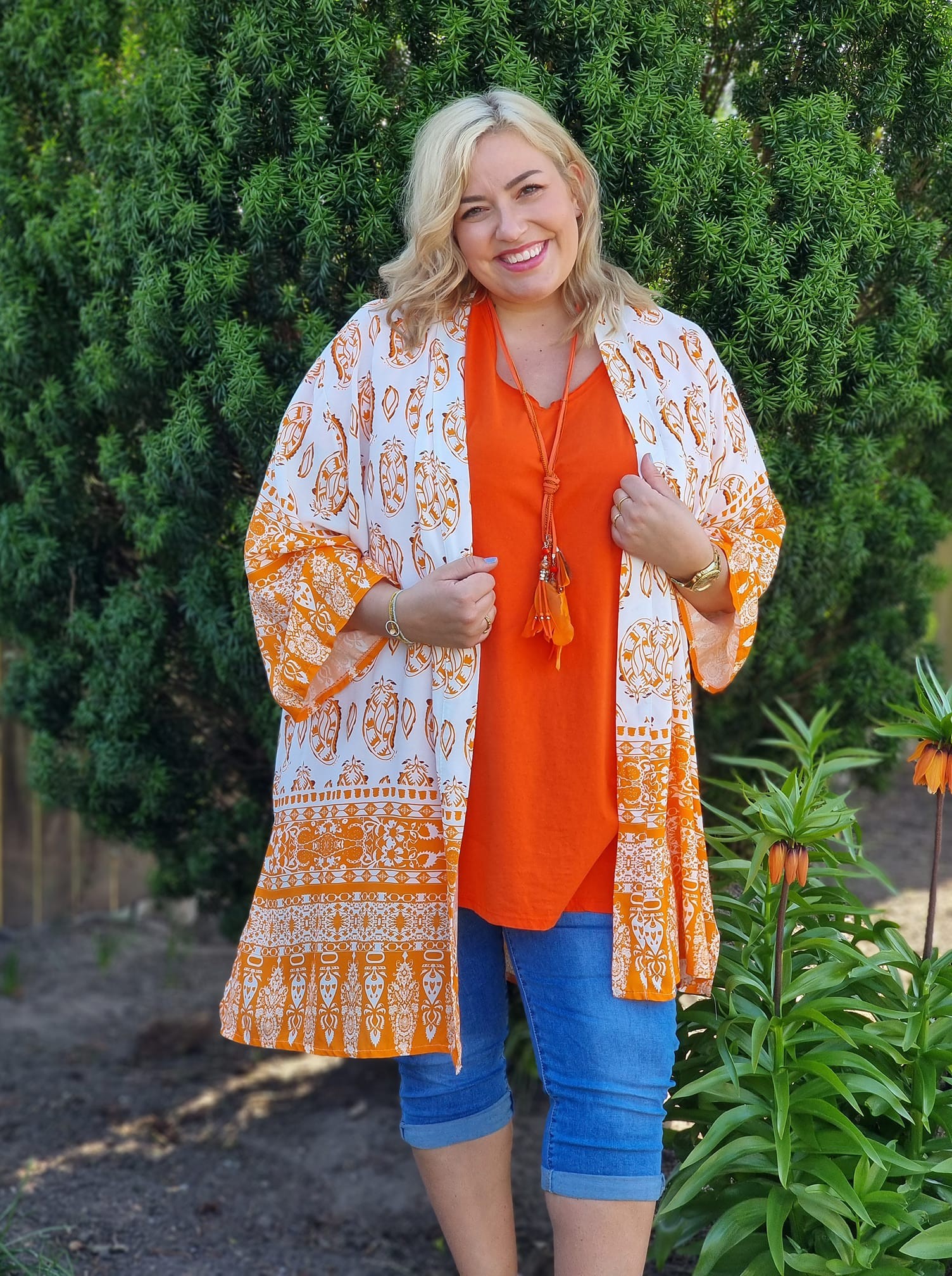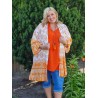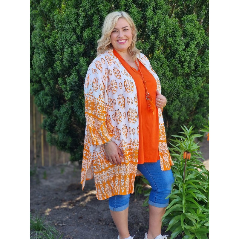 132940 Kimono PLUS SIZE med mønster. Viscose. One Size. Orange PASSER OP TIL STR 52.