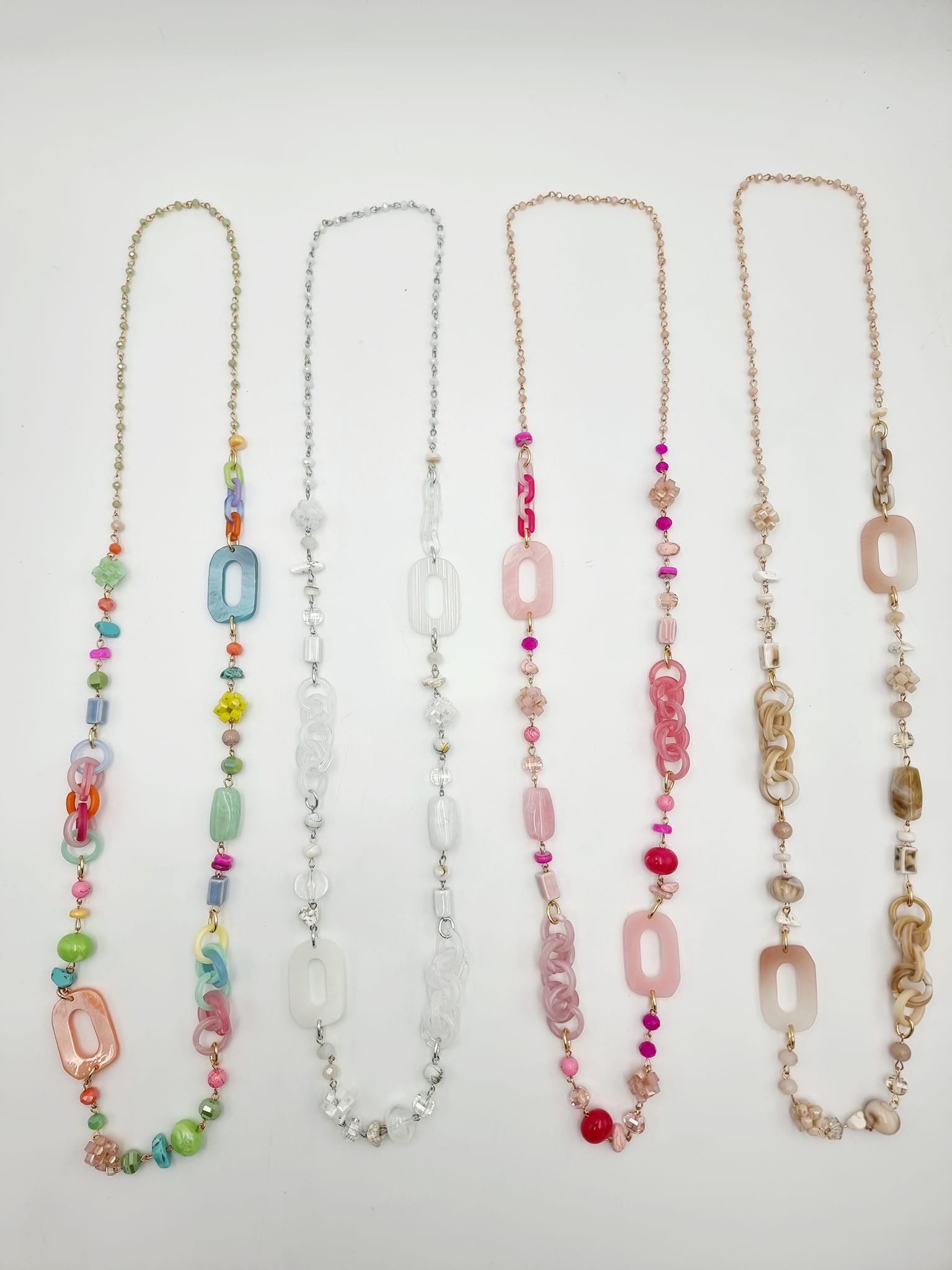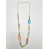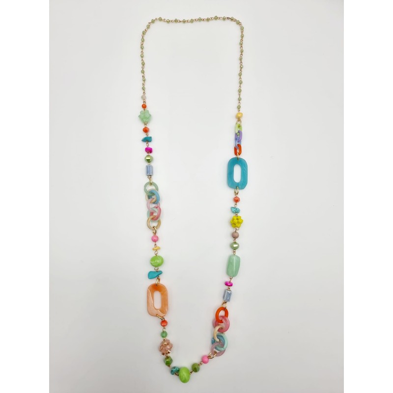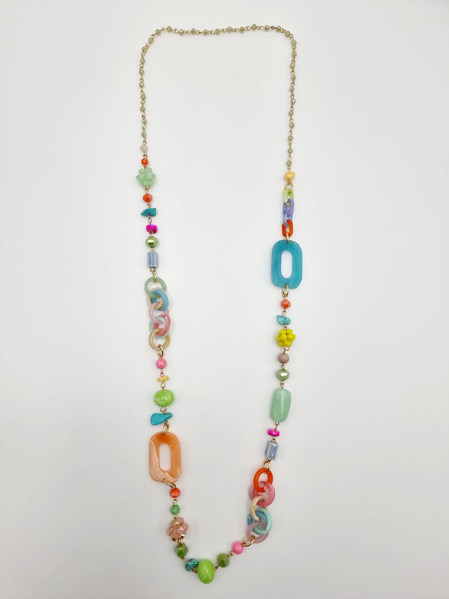 Halskæde lang med forskellige former perler & 2 firkanter. Multi