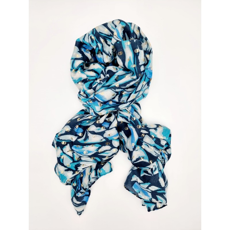 Tørklæde ( S22458 ) med mønster & guldprint. Viscose/Bomuld. Blå