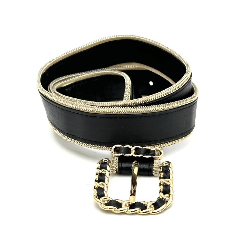 Add a modern twist to your outfit with this novelty belt, which features an eye-catching zipper effect on the strap and an elegant gold buckle. The belt is 3.5 cm wide and made of durable synthetic materials, which ensures both style and comfort. This unique zipper detail gives the belt a raw and stylish look, perfect for both everyday and parties. The classic gold buckle adds a luxurious finish that makes the belt a must-have accessory for any wardrobe.