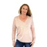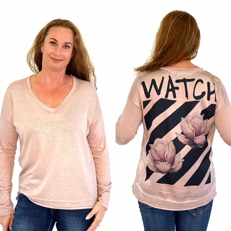 133020 Blouse (11850) shiny with "Watch" print on the back. One Size. Rose