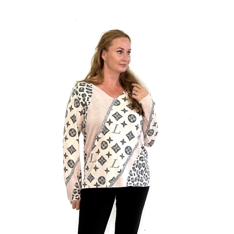 133084 Blouse with silver edges & print. Nude