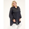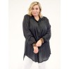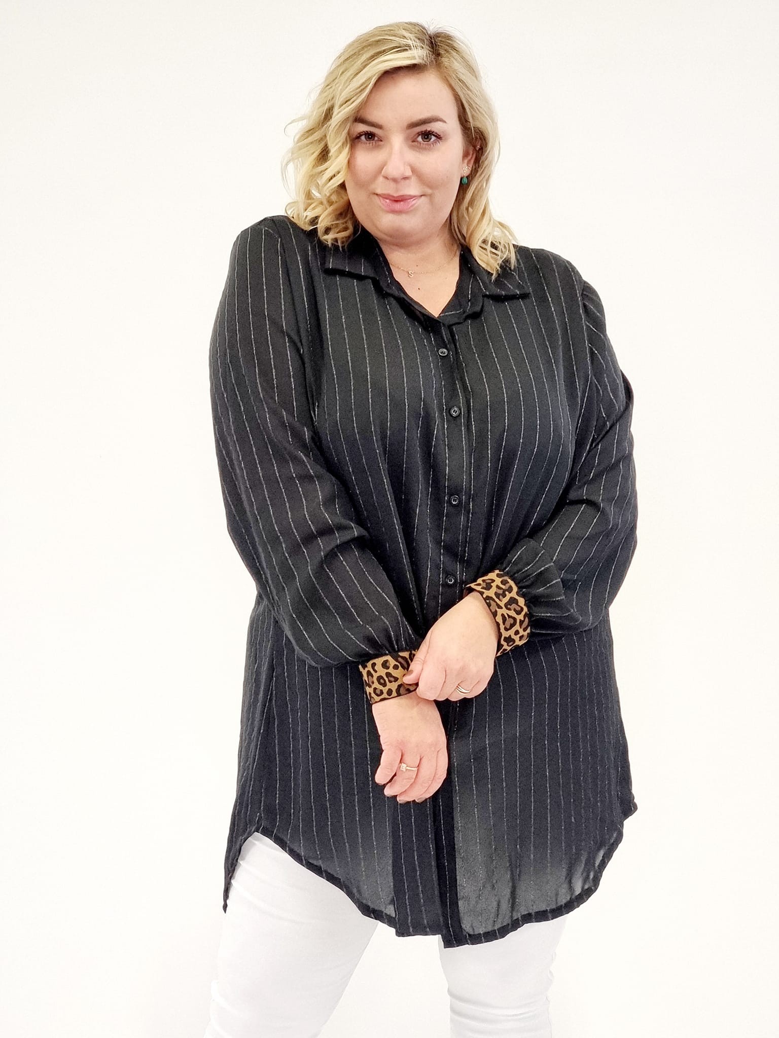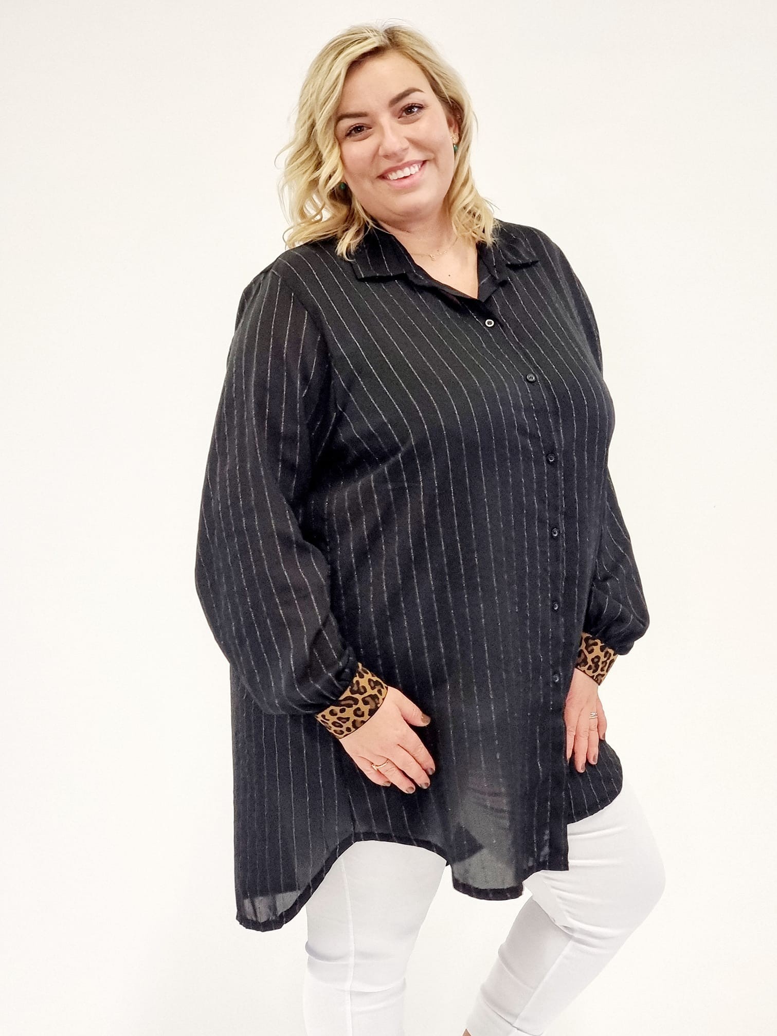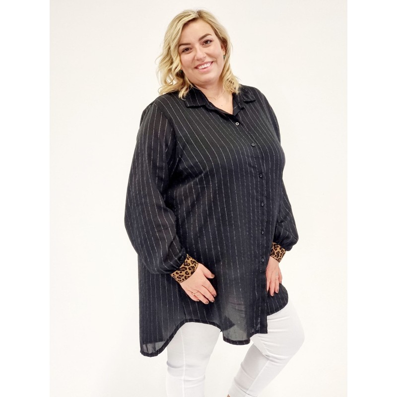 133092 Shirt PLUS SIZE ( 2671) long button-through with silver thread & leopard at the sleeves. Black