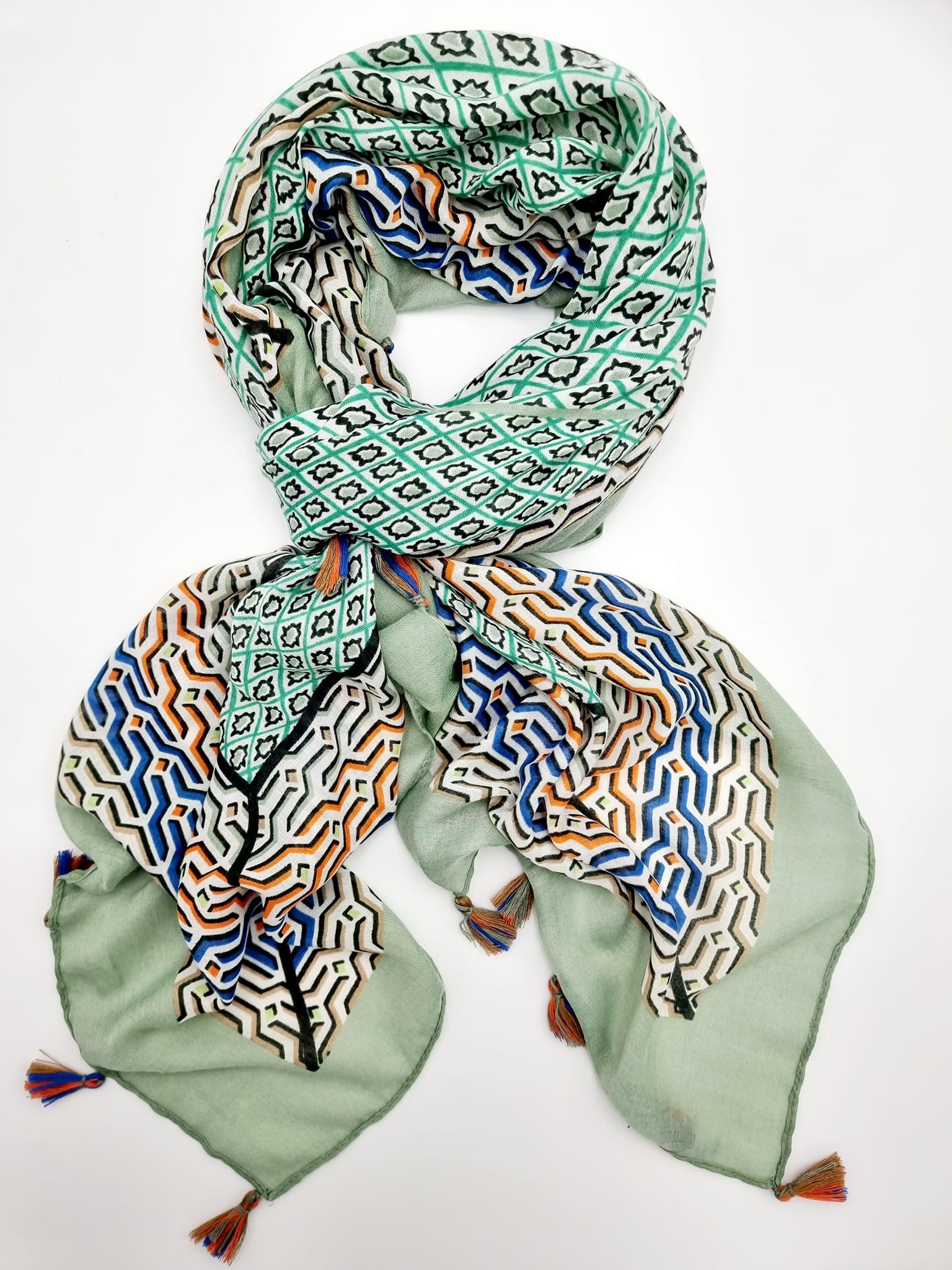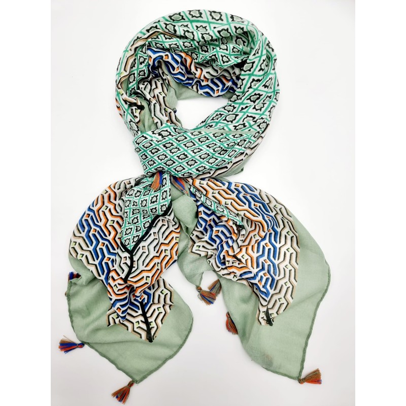 312108 Scarf with pattern & tassel. Green