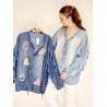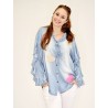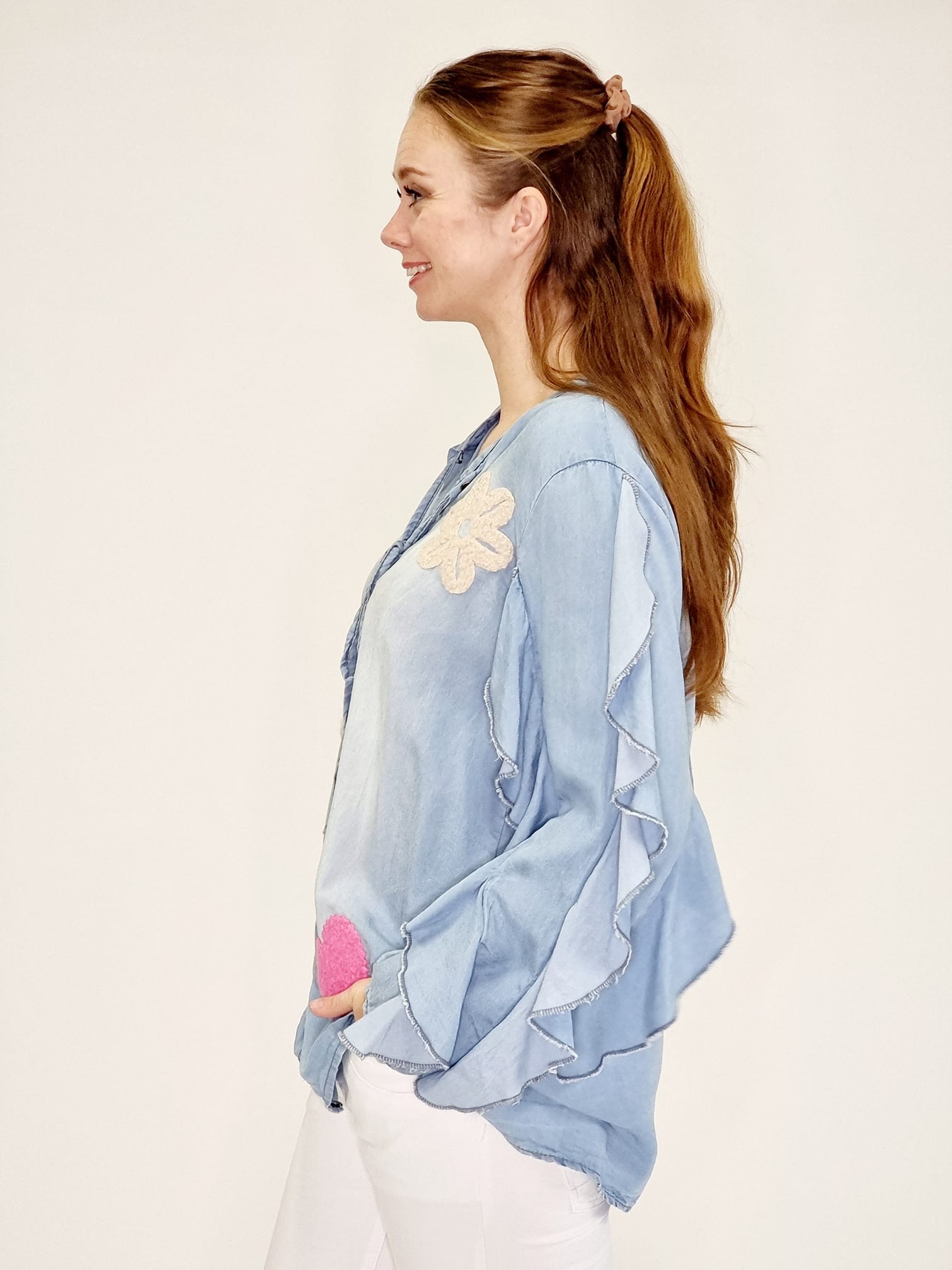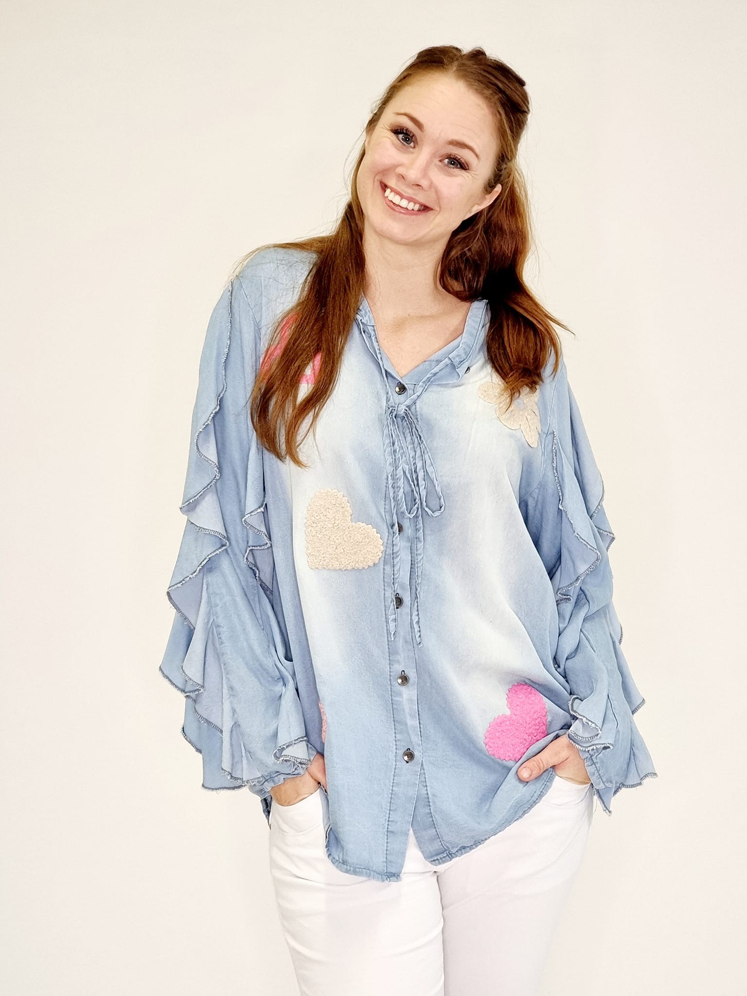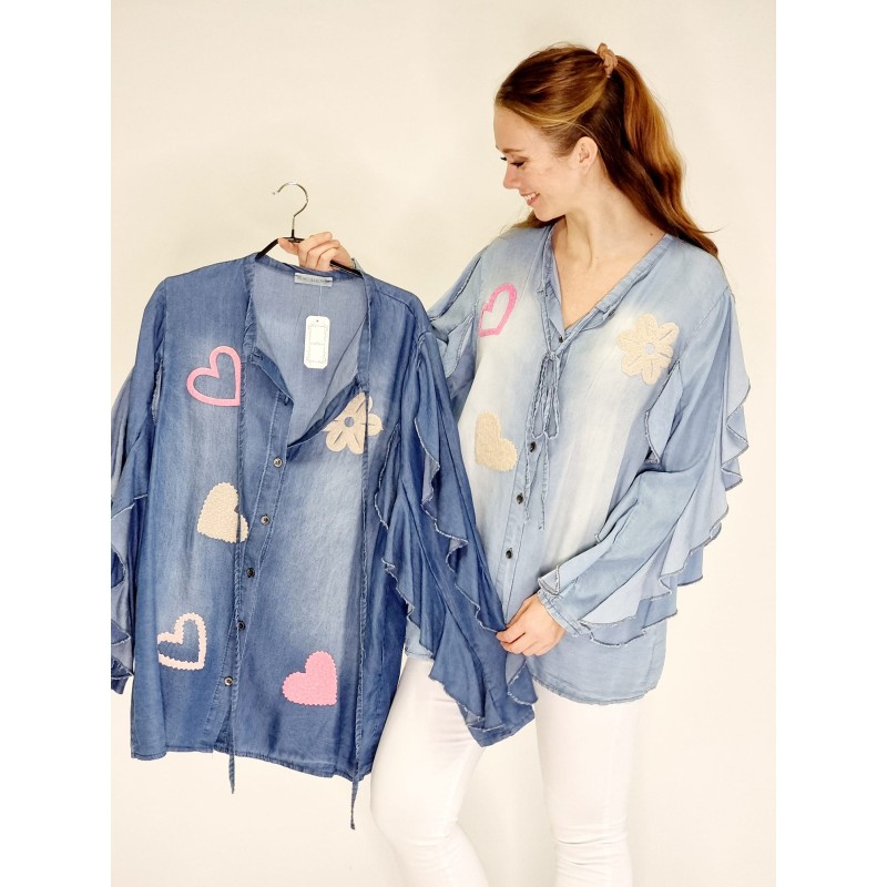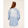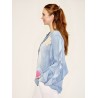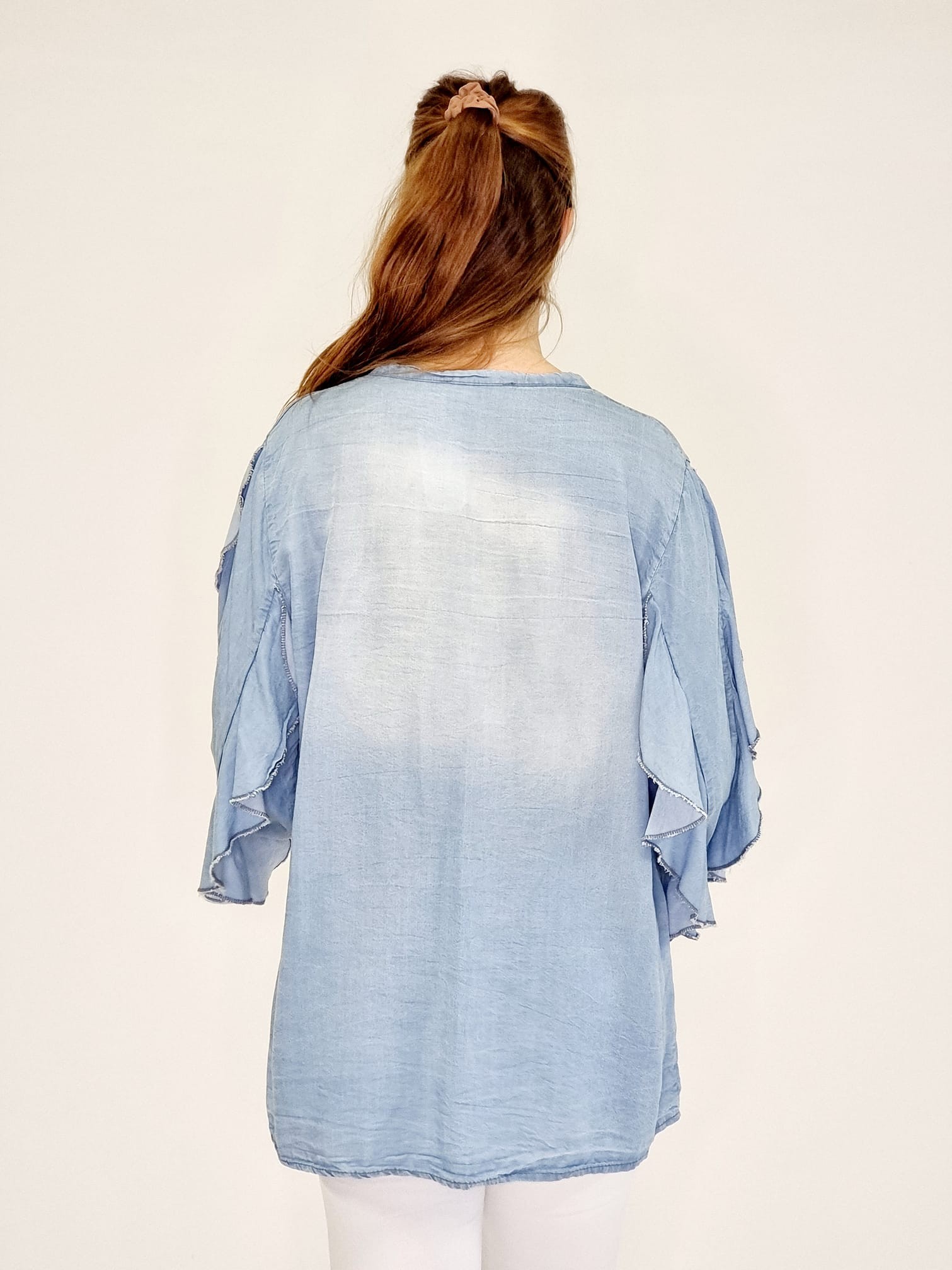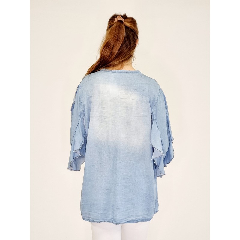 Styleno 133243 Shirt with print / tie in neck & ruffles on the sleeves. Light blue.