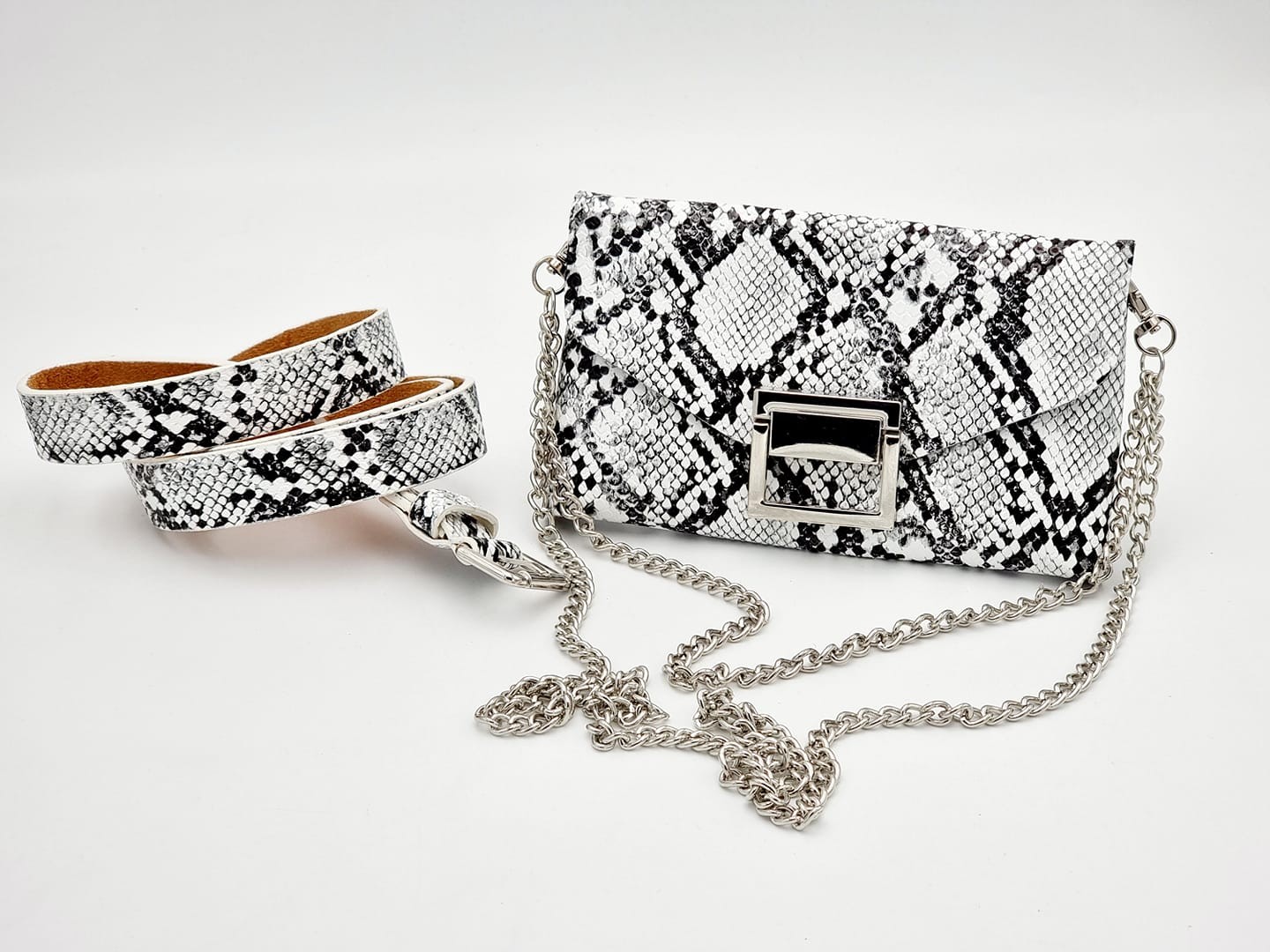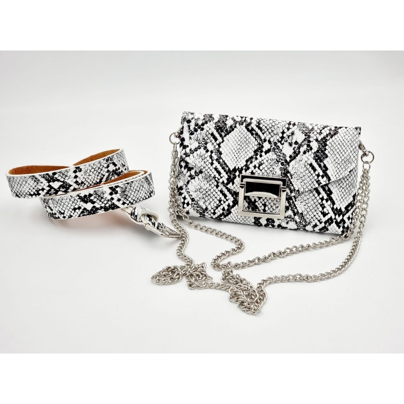 411911 Bag & Belt with silver buckle. 18x10 cm Synthetic. Snake/White