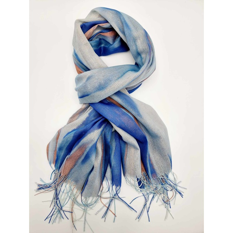312404 Scarf ( S-70013 ) batik stripes & gold dust/fringe. Viscosa. Blue