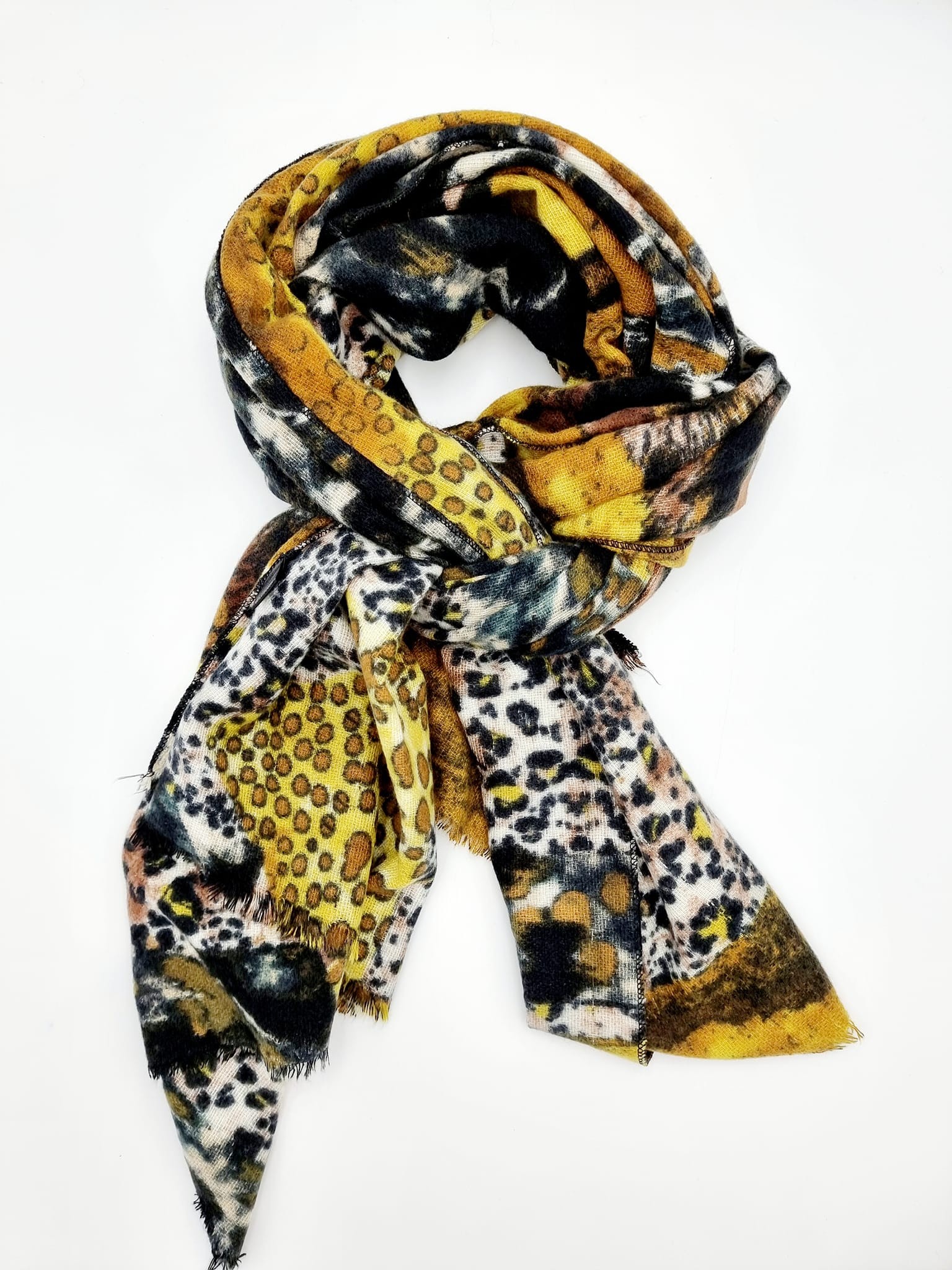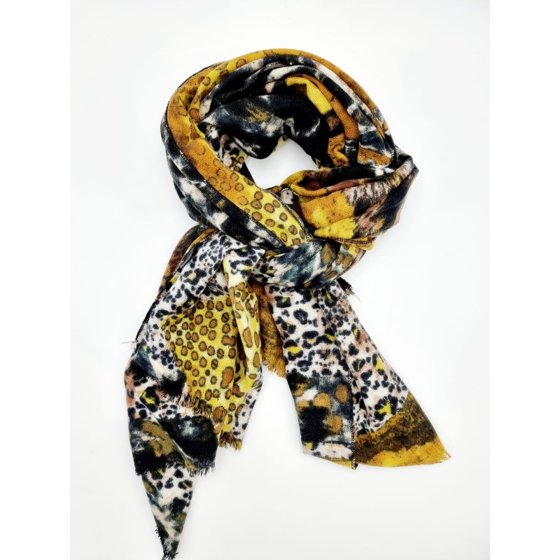 312021 Scarf with mixed animal print. Curry